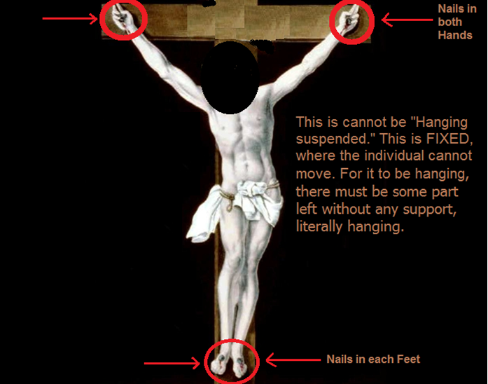 As you see the picture it is quite clear that Acts 5:30 and the 4 Gospels account of the Crucifixion contradict each other. As I have demonstrated, the way Jesus was crucified in no way could mean “hanging suspended.” The above picture shows that the person who is nailed is FIXED. For it to be Hanging it has to have some part left without any support.