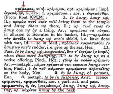 KPEMA, f… I cause to hang, suspend ii.. 19. Acts 5:30 f… aor. I suspend myself, am suspended, I hang, Acts 28:4.— depend ,Mat. 22. 4. Thou hast suspended, didst hang ii… I hang over a precipice, suspend… [11]