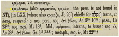 In all above four Gospels accounts we see the Greek word that is used is “Stauroo” which means “Crucified” with nails through. But in Peter’s account, that is recorded by Luke in Acts, the word that is used as I showed earlier is “kremannymi” which means “hanged.” One thing to note, the Greek word “Stauroo,” in no Lexicon does it mean “hanging”. Let us take a closer look at the Greek word “kremannymi” and see what have Lexicons/Dictionaries have to say about it.