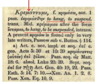κρεμάσαντες 1. Aor. Pass. to hang, suspend; mid to hang, to be suspended. [13]