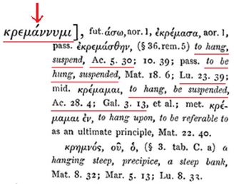 κρεμάσαντες to hang up, to suspend, Matt. Xviii. 6. Acts, V. 30 x.39; mid., to hang Acts, xxviii. 4. Gal. Iii. 13; with to depend upon Matt. Xxii, 40. (“All the Law and the Prophets, i.e the teaching of the OT on morality, is summoned up in these precepts,” Thayer.) [14]