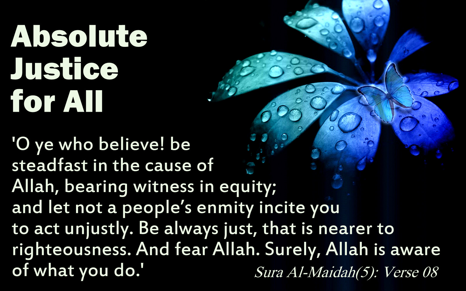 The true justice described in the Qur’an commands man to behave justly, not discriminating between people, protecting others’ rights and not permitting violence, no matter what the circumstances, to side with the oppressed against the oppressor and to help the needy.