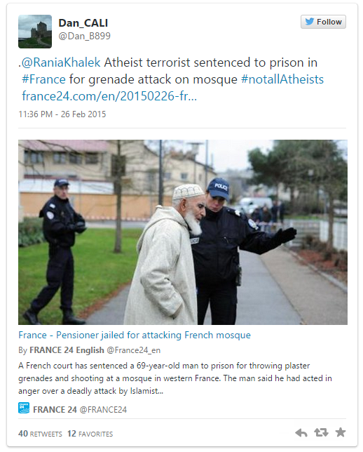 Will the media now ask (not that they should) moderate atheists to condemn this act of terrorism I won’t hold breath.