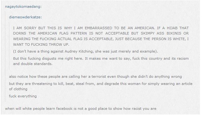 11. I don’t get how wearing underwear with the American flag on it, which undoubtedly gets at least traces of shit and piss on it due to it’s intimate placement, is acceptable when this isn’t? Oh dear extremists on both sides of the fence disgust me. However I don’t appreciate the “when will white people…” comment on the tumblr post, just as the vast majority of muslims are not terrorists the vast majority of white people are not complete freaking morons. Sadly the loudest tend to be the most ridiculous. The ones who made the comments on Facebook need to learn to zip their mouths and not to repeat the same drivel that everyone around them says, but some, few, of those against it need to learn not to fight fire with fire.